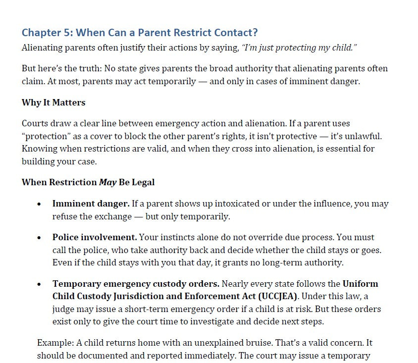 .pdf digital download. The Resolute Alienation Guide is a practical, court-focused resource for parents facing the painful reality of parental alienation. Designed to help mothers and fathers navigate custody battles, it explains how to document patterns, respond to false accusations, and present evidence effectively in family court. A step-by-step companion for protecting your child’s right to both parents.